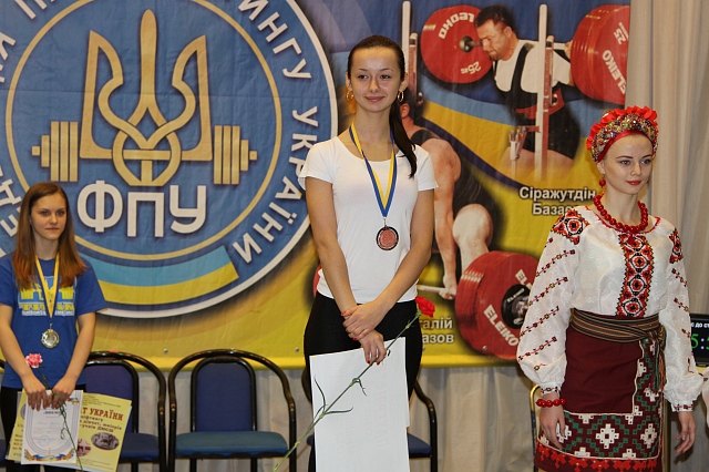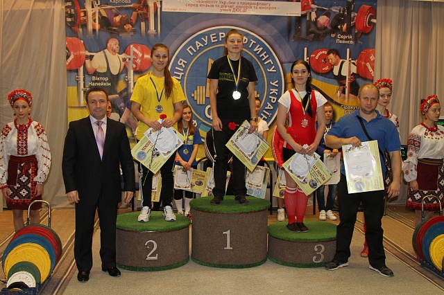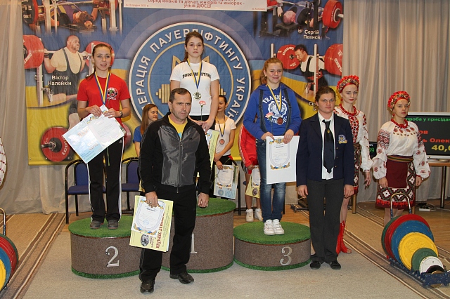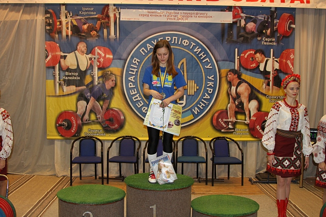 У девушек, в первый день, борьбы было намного больше. Было разыграно 10 комплектов наград, среди молодых спортсменок. В категории до 47 кг победила Александра Пахнюк, собрав сумму - 212.5 кг.В категории до 52 кг победила Елизавета Двойнишникова, собрав сумму - 262.5 кг. В категории до 57 кг победила, мастер спорта, Мария Ильницкая, собрав сумму – 290 кг. Это была вторая возрастная группа.